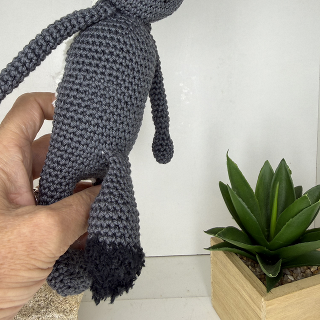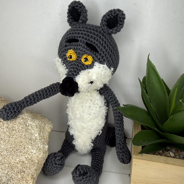 loup solitaire au crochet, qui change de comportement pour avoir des amis , il est entièrement crocheté à la main dans un coton oeko tex de qualité, rempli de ouate anti feu.