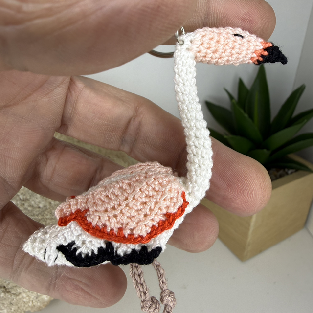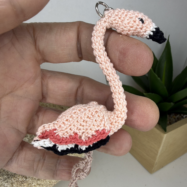 adorable porte clé flamant rose réalisé entièrement à la main en micro crochet . Le micro crochet permet de travailler tout en finesse et de bien souligner les détails.